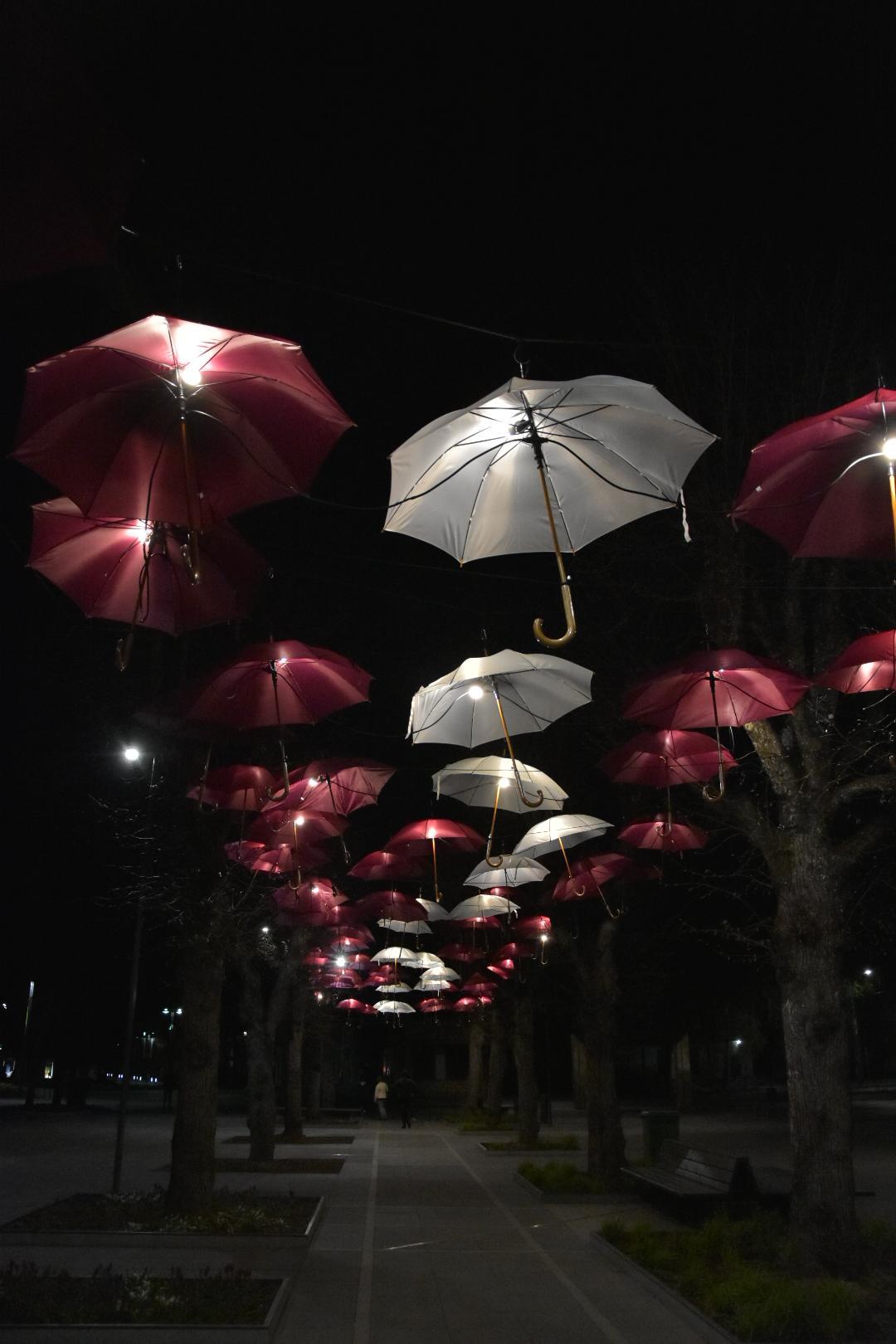 Небольшая аллея с зонтиками парящими над головами . По мне так готовое место для фотосессии.