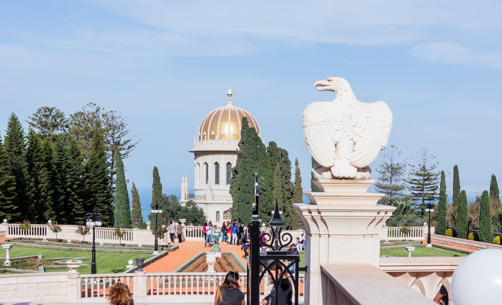 Прекрасный сад разбитый вокруг храма последователей Бахайской религии. Символ города. Туристическая достопримечательность. Прекрасный вид с горы на нижний город, сам сад и Средиземное море.