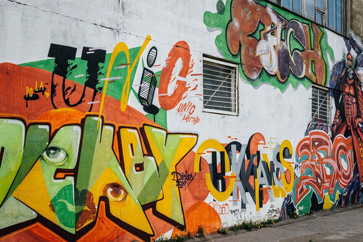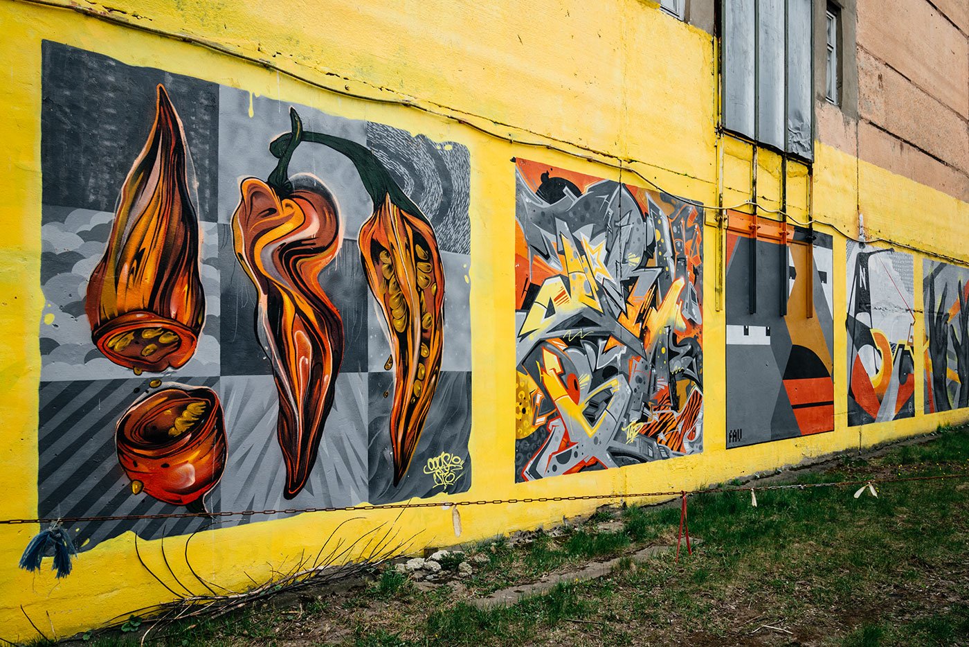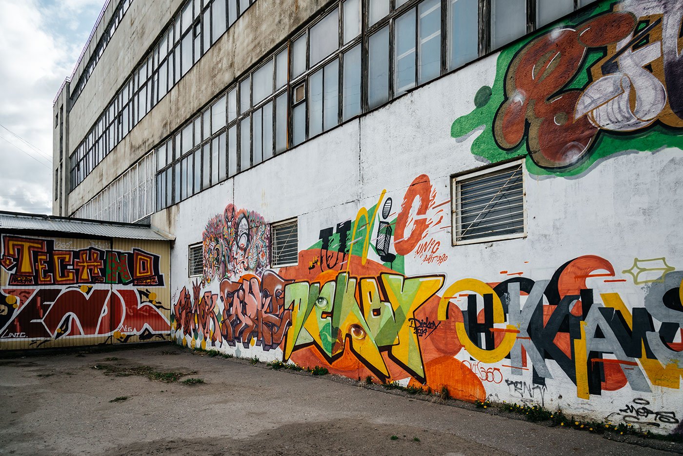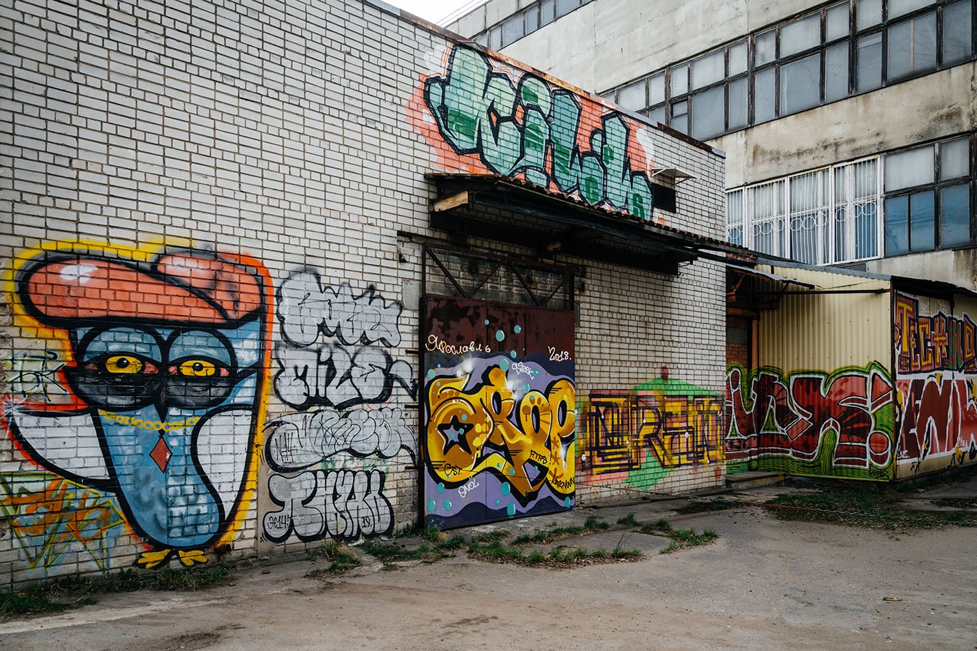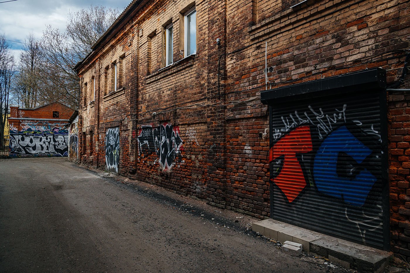 Несколько домов с граффити на стенах, расположенные во дворах на углу улиц Республиканская и Свободы. Для фотосессий также подойдёт фактурная кирпичная стена из тёмного бордового кирпича.