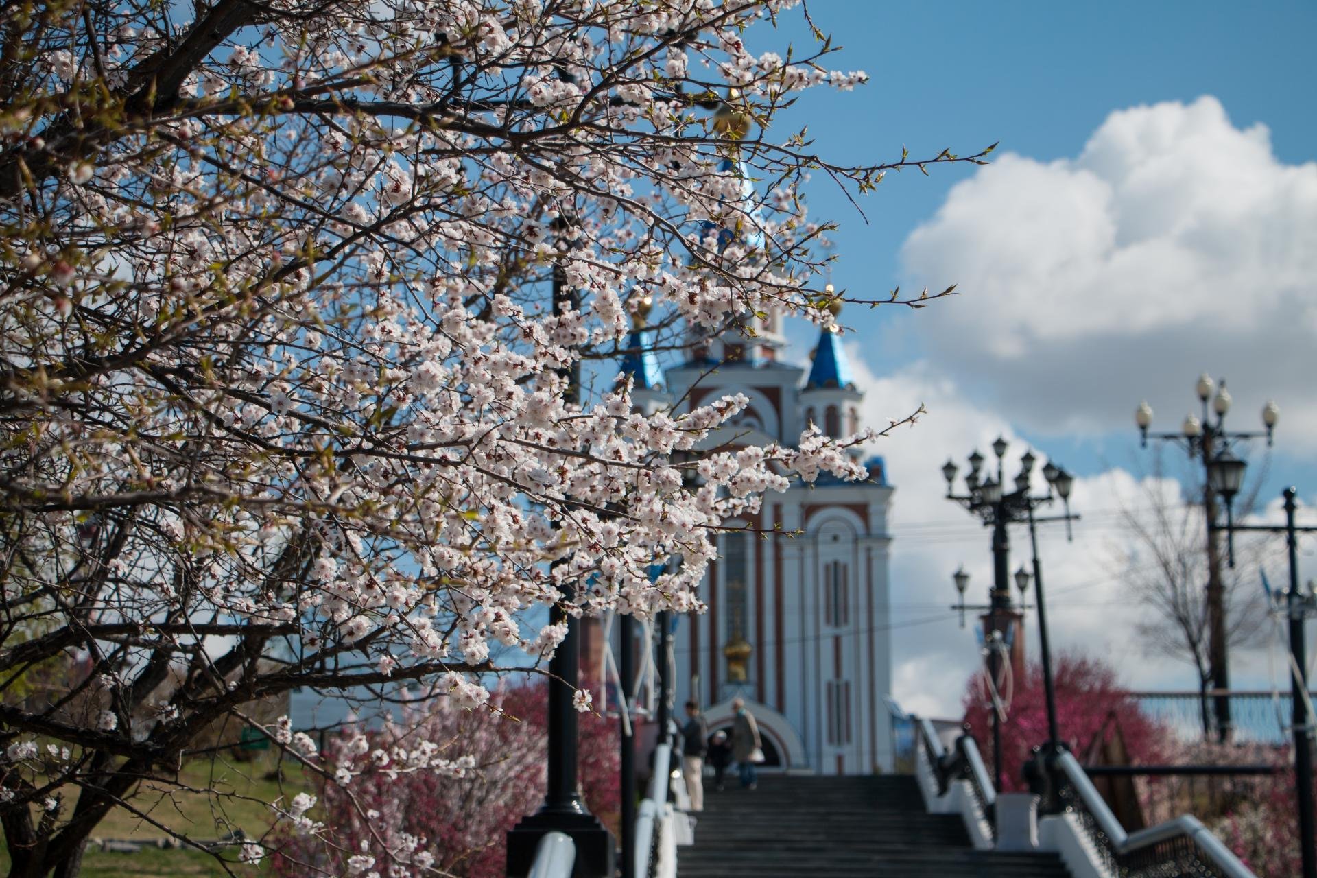 Проводить фотосессии здесь лучше во второй половине дня (на фотографии - утро). Тогда солнце будет освещать лица, а фоном - прекрасный храм, лестница и небо в облаках. В Хабаровске солнце - 300 дней в году:) Наилучшее время года для фотосессий - май и конец сентября. Когда вишни и дальневосточный миндаль вдоль лестницы цветут или покрыты яркими красно-жёлтыми листьями.