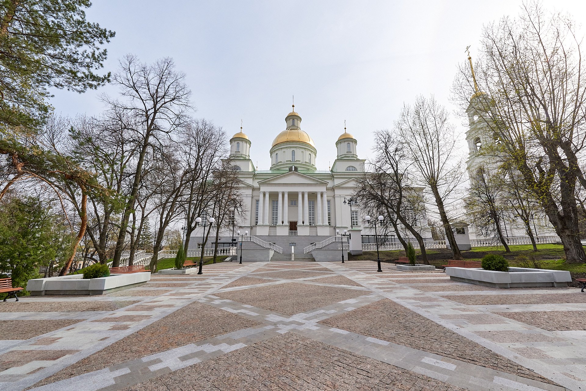 Новый культовый комплекс. Белые колонны, красивая плитка, живописная зелень и виды на главный православный храм города. С колокольни открывается вид на весь город.